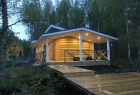 Баня на монолитной железобетонной плите из бревна с двумя пристройками террасой размером 6*3 м2 и дровяником 6*3 м2.