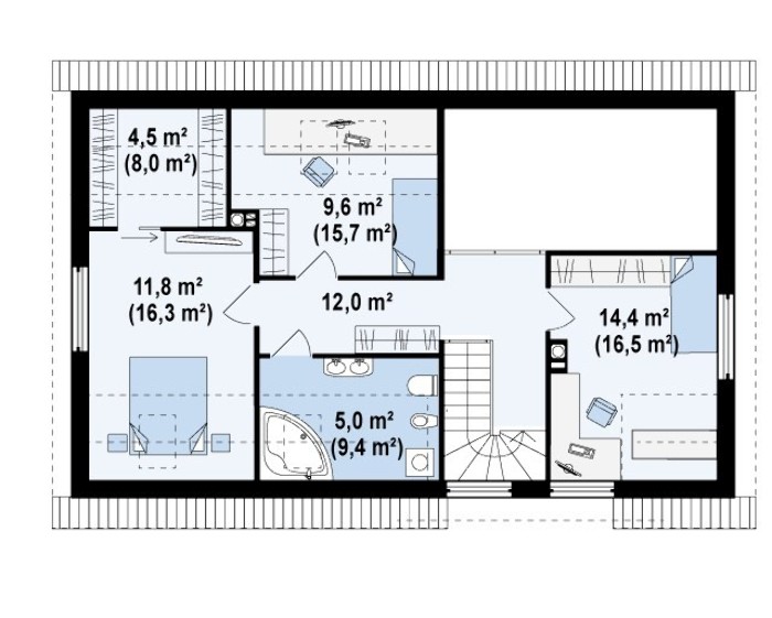 Площадь на втором этаже, которую архитекторы использовали для расширения пространства гостиной, не ограничивает возможностей рационального использования жилой мансарды. За счет удачной планировки, на втором этаже расположились три уютные спальни, большая ванная комната и просторный гардероб для всей семьи.