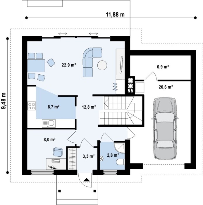 | Размеры дома: | 11.88 м х 9.48 м |
