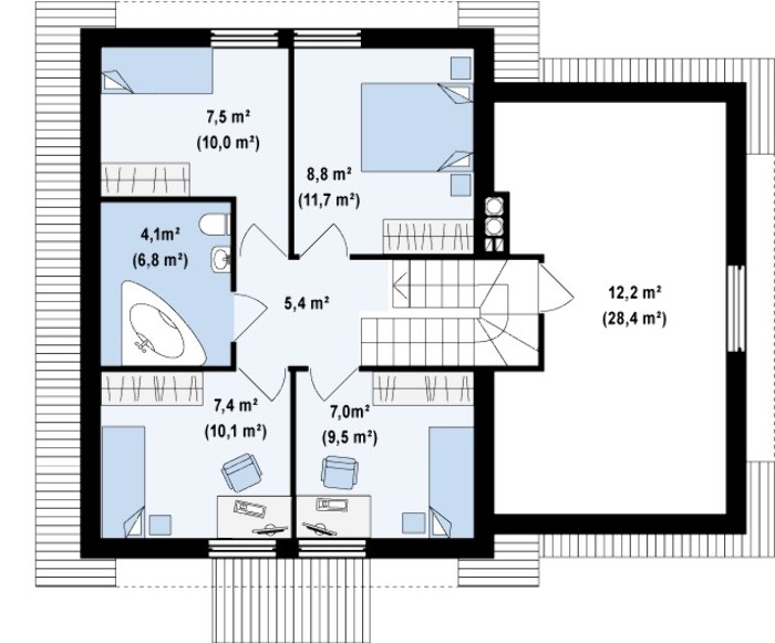 На втором этаже искусно размещены четыре спальни и ванная, совершенно не стесняя друг друга в размерах.